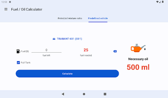 De Fuel Oil Mix Calculator is een gebruiksvriendelijke app voor Android, ontworpen om de juiste hoeveelheid olie te berekenen voor het tanken van tweetakt benzinemotoren. Gebruikers kunnen de gewenste mengverhouding invoeren of kiezen uit een lijst van vooraf gedefinieerde voertuigen, en door de hoeveelheid brandstof in te voeren, wordt de exacte hoeveelheid olie voor de mengeling berekend. Deze app is gratis beschikbaar en biedt verschillende handige functies die het gebruik vergemakkelijken.